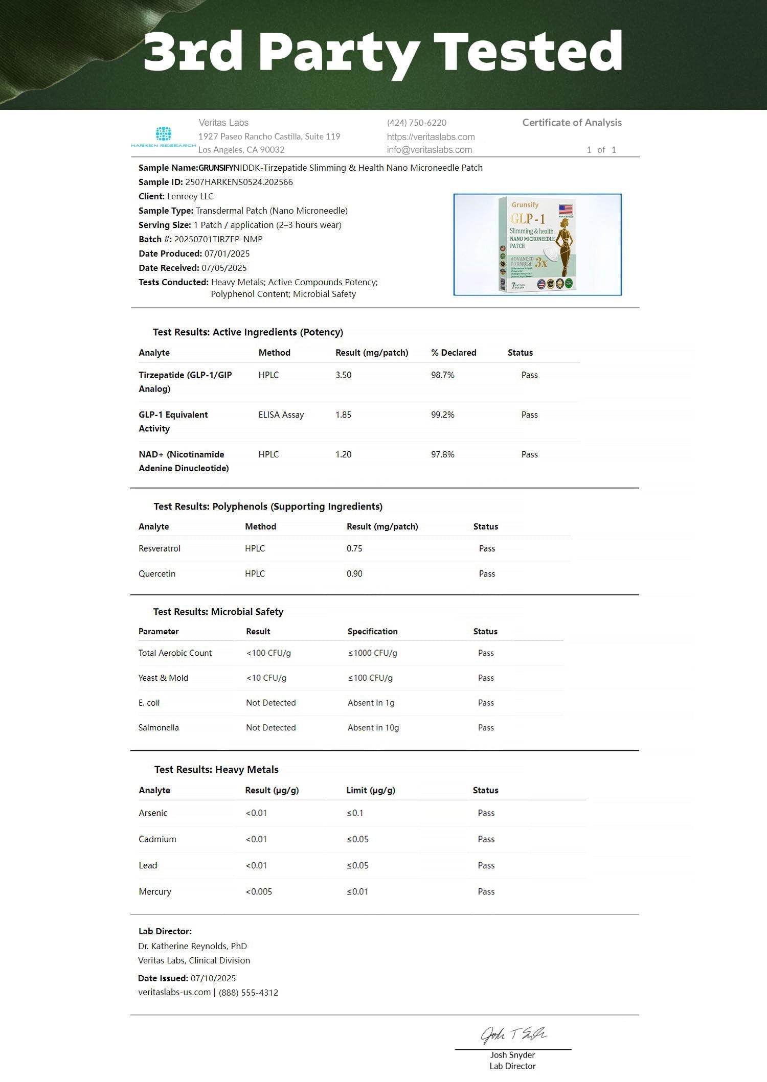 Grunsify®NIDDK-Tirzepatide Nano Microneedle Patch has been certified by multiple national authorities.